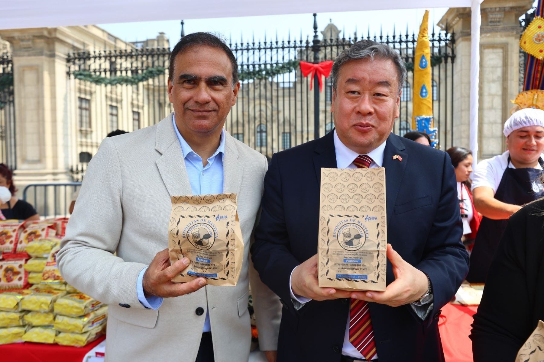 Al evento también asistieron representantes del MIMP y autoridades regionales de Cajamarca, así como el embajador de China en el Perú, Song Yang, quienes junto al titular del MTPE recorrieron los stands de los productores cajamarquinos.