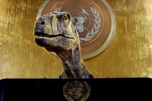 La ONU echó mano este miércoles de la experiencia de los dinosaurios con una original campaña de crisis climática en la que, gracias a los avances de la tecnología, uno de estos animales invadió virtualmente el hemiciclo de la Asamblea General para expresar su estupefacción por el hecho de que los humanos se estén extinguiendo a sí mismos.