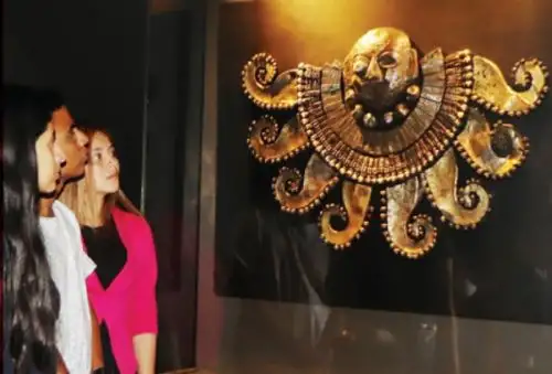 En uno de los pisos se exhiben otras piezas de oro, cobre y sobrios tejidos, entre las cuales se destacan orejeras de oro y turquesa, una imagen felina completa, un pectoral de oro confeccionado con caracoles, collares de oro con representaciones de maníes, varios estandartes, una sonajera de oro con la figura de un degollador y un pectoral de cobre.