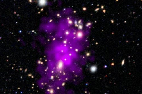 La imagen, elaborada a partir de observaciones del Observatorio de Rayos X Chandra y telescopios ópticos de los Legacy Surveys, muestra dos cúmulos galácticos en proceso de colisión. Esta fusión, que dará lugar a un cúmulo aún más grande, se distingue por la distribución vertical del gas caliente (mostrado en púrpura), un indicio de la interacción entre ambas estructuras cósmicas.