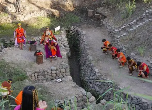 La escenificación, lo realizaron más de 50 estudiantes del Instituto Superior Tecnológico de Nasca, de la especialidad de turismo, que recrearon con fidelidad los rituales y cánticos que los antiguos nascas realizaban en honor al agua.