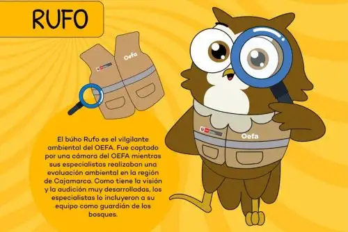 * Rufo es el búho vigilante ambiental del OEFA. Fue captado por una cámara del organismo mientras sus especialistas realizaban una evaluación ambiental en la región de Cajamarca. Es un ave rapaz con visión y audición altamente desarrolladas; los especialistas lo incluyeron en el equipo como guardián de los bosques.