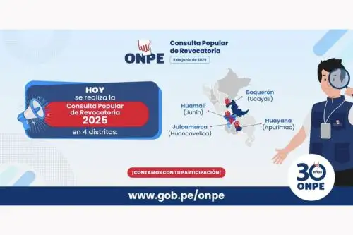 La Oficina Nacional de Procesos Electorales (ONPE) viene publicando en su página web institucional los resultados de la Consulta Popular de Revocatoria del Mandato de Autoridades Municipales 2025, que se llevó a cabo hoy en Boquerón (Padre Abad, Ucayali), Huayana (Andahuaylas, Apurímac), Huamalí (Jauja, Junín) y Julcamarca (Angaraes, Huancavelica).