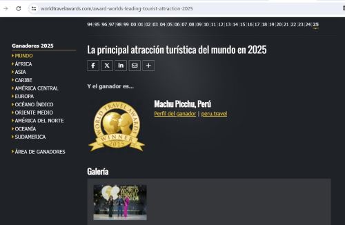 En tanto, Promperú (Comisión de Promoción del Perú para la Exportación y el Turismo) ganó la categoría como Mejor Oficina de Turismo Mundial 2025 (World's Leading Tourist Board 2025).