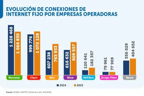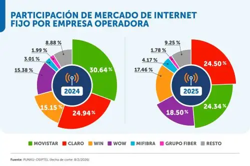 Refirió que pese a mantener el liderazgo del mercado de internet fijo de fibra óptica, Movistar (24.25%) retrocedió 5.34 puntos porcentuales respecto al cierre de 2024. A continuación, se ubica Wow con 22.43% del mercado, 1.78 puntos porcentuales más que el mismo periodo del año anterior, superando a Win, que se sitúa en el tercer lugar (21.17%). Seguidamente, se encuentran Claro (16.67%), MiFibra (5.05%), el Grupo Fiber (2.16%) y otras empresas (8.27%).