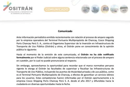 El Organismo Supervisor de la Inversión en Infraestructura de Transporte de Uso Público (Ositrán) informó que hasta el momento no ha sido notificado formalmente por el Poder Judicial sobre alguna sentencia relacionada con el proceso de amparo iniciado por la empresa Cosco Shipping Ports Chancay Perú S. A. respecto al Terminal Portuario Multipropósito de Chancay.