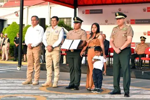 Durante la ceremonia, el presidente del Consejo de ministros, Luis Arroyo, junto al ministro del Interior, José Zapata, impuso las insignias de mando al agente del orden, que alcanzó el grado inmediato superior al ascender a suboficial de primera de la PNP.