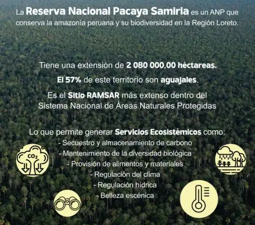 La Reserva Nacional Pacaya Samiria desempeña un rol clave para mitigar los efectos del cambio climático, dado que sus bosques y humedales almacenan alrededor del 40 % del carbono retenido en el territorio peruano.