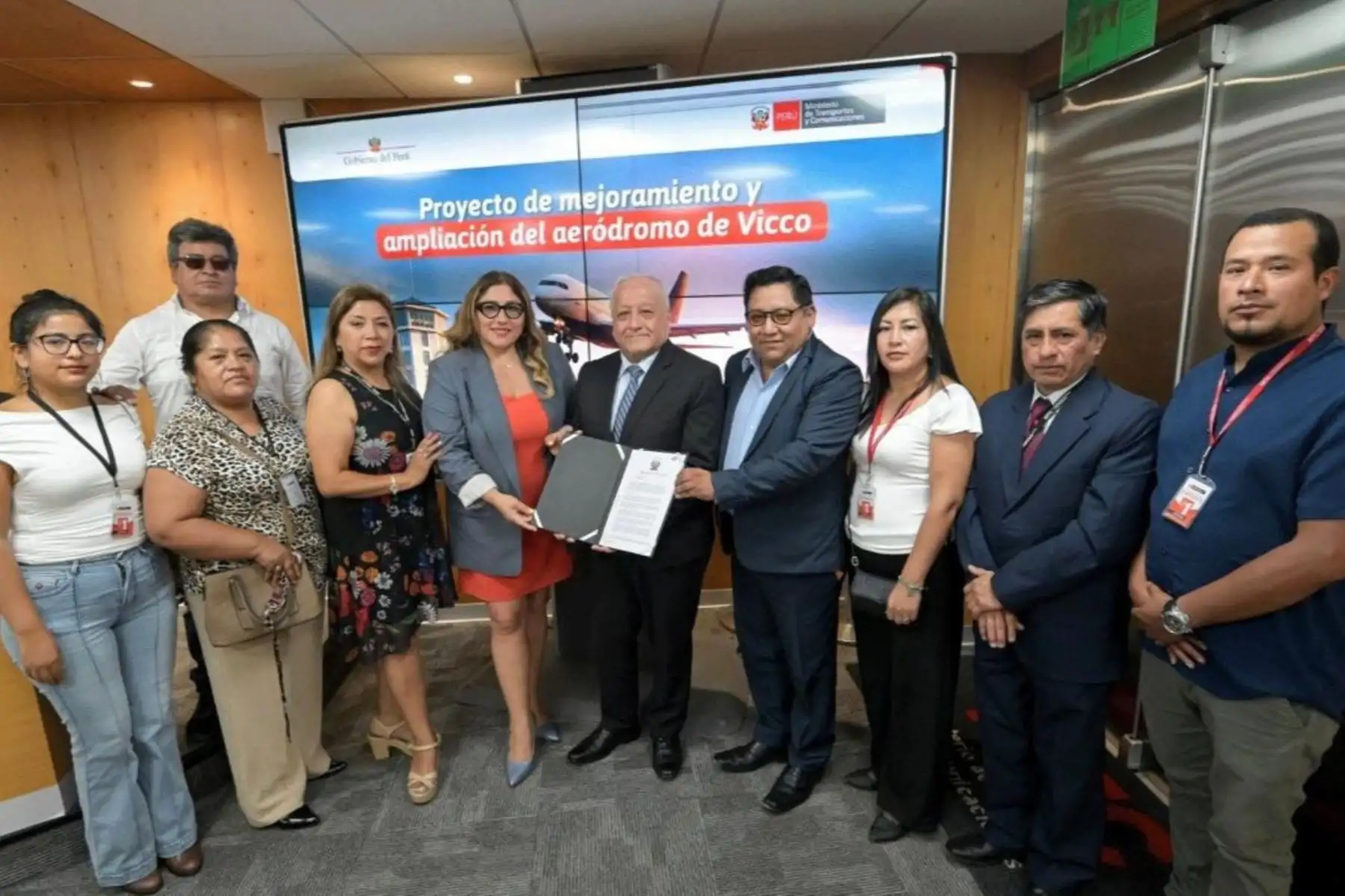 En una ceremonia oficial, el viceministro de Comunicaciones, Raúl García Loli, y la directora general de Aeronáutica Civil, Paola Marín, entregaron al alcalde de la municipalidad distrital de Vicco, Luis Malpartida Mauricio, la resolución directoral que autoriza el proyecto de S/ 137 millones.