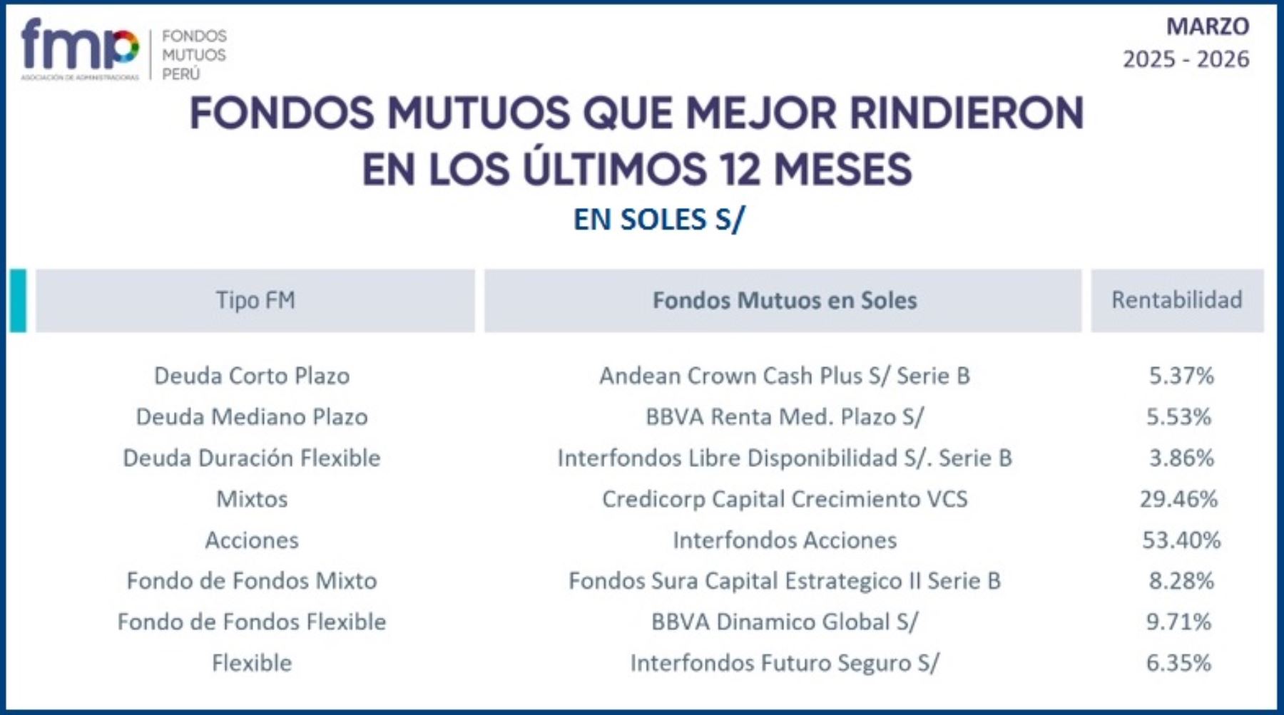 Los asociados a la FMV son BBVA Asset Management SAF, Credicorp Capital SAF, Fondos Sura SAF, Interfondos y Scotia Fondos.