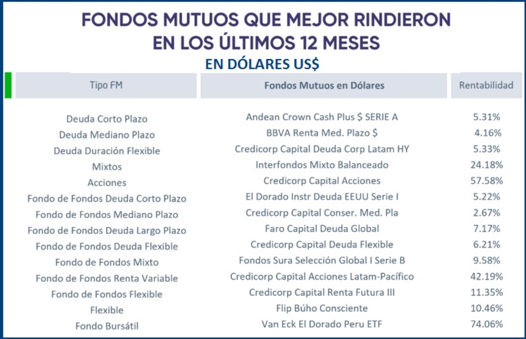 Entre tanto, en los últimos 12 meses, el fondo mutuo en soles más rentable fue también para IF Acciones Interfondo con 53.40%, mientras que el fondo mutuo más rentable en dólares, en el último año, fue Van Eck el Dorado Perú ETF con 74.06% de retorno.