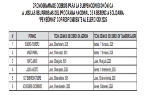 El Ministerio de Desarrollo e Inclusión Social (Midis) aprobó la modificación del cronograma de cobros para la subvención económica a los/las usuarios/as del Programa Nacional de Asistencia Solidaria “Pensión 65” correspondiente al ejercicio 2025.