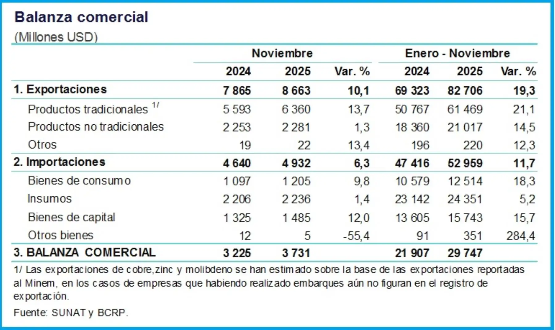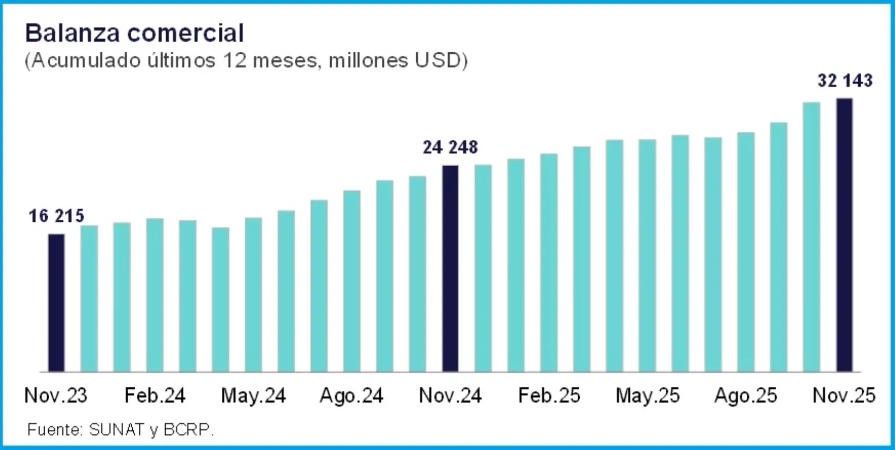 El superávit de la balanza comercial acumulada en los últimos 12 meses continuó con su tendencia creciente en noviembre de 2025, alcanzando los 32,143 millones de dólares, indicó el Banco Central de Reserva del Perú (BCR).