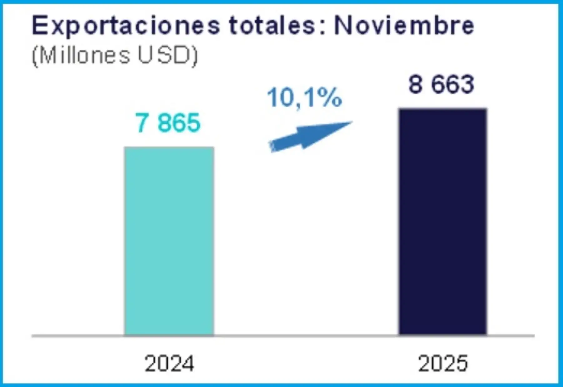En este contexto, en noviembre de 2025 el valor de las exportaciones totales ascendió a 8,663 millones de dólares, lo que representó un crecimiento de 10.1% respecto a noviembre de 2024.