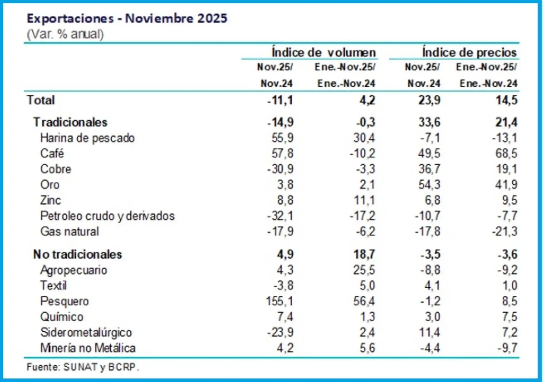 Este crecimiento respondió tanto al efecto precio, que se expandió 14.5% —con un mayor aporte de los productos tradicionales (21.4%) —, como al aumento de 4.2% en los volúmenes exportados, impulsado principalmente por los bienes no tradicionales, que registraron una expansión de 18.7% en dicho periodo.