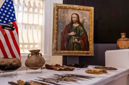 Entre los objetos recuperados hay pinturas coloniales, textiles, adornos de plata, cerámica y objetos elaborados con materiales preciosos, incluidas piezas asociadas con importantes culturas precolombinas como la de Chancay.