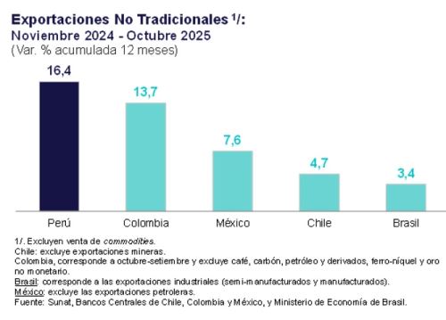 Perú registró el mayor incremento de las exportaciones no tradicionales entre los principales países de la región con un incremento registrado de 16.4% en el período acumulado de 12 meses a octubre, informó el Banco Central de Reserva (BCR).