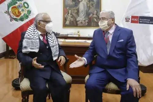 El presidente del Consejo de Ministros, Aníbal Torres, recibió hoy la visita protocolar del embajador de Palestina en el Perú, Walid Muaqqat, quien le transmitió el saludo del Primer de Ministro del Estado de Palestina y la más amplia voluntad de su país para fortalecer los lazos de amistad y cooperación con el Perú.
