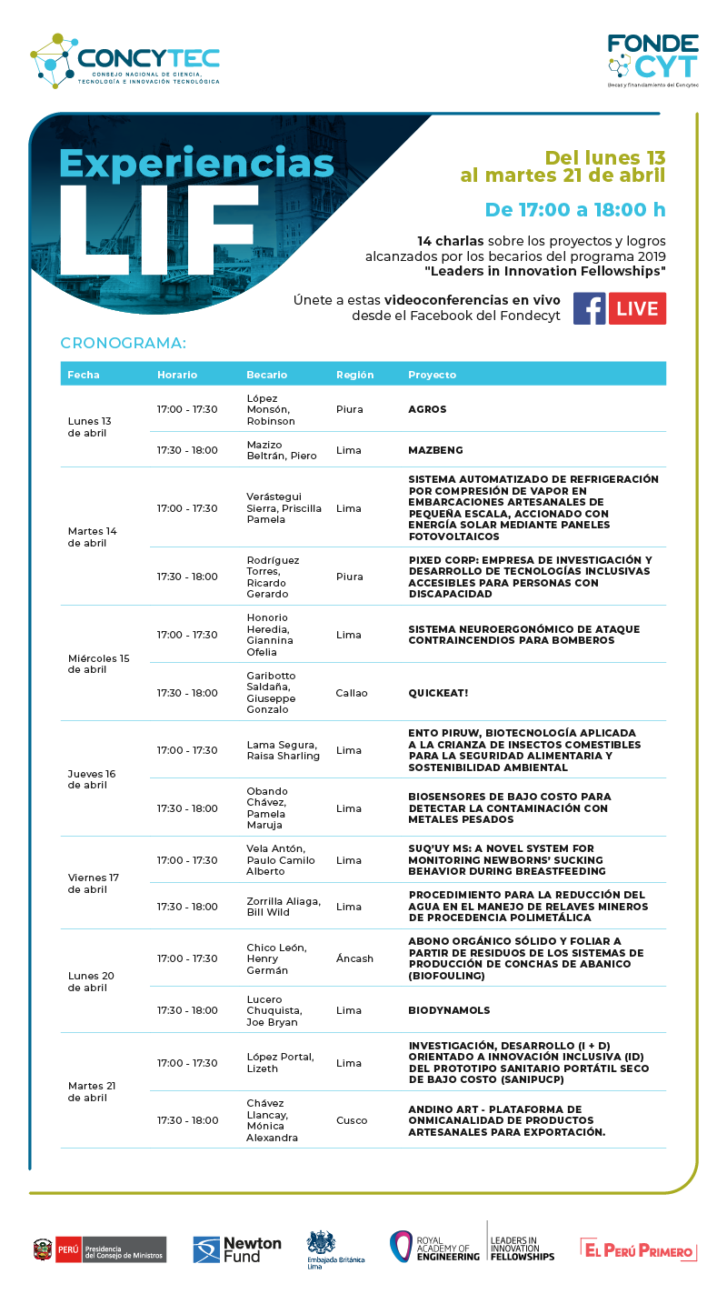 El Consejo Nacional de Ciencia, Tecnología e Innovación Tecnológica (Concytec) realizará conferencias sobre el programa de becas Líderes en Innovación (LIF, por sus siglas en inglés) de manera virtual, del 13 al 17 y del 20 al 21 de abril, de 5:00 p. m. a 6:00 p. m. cada día.