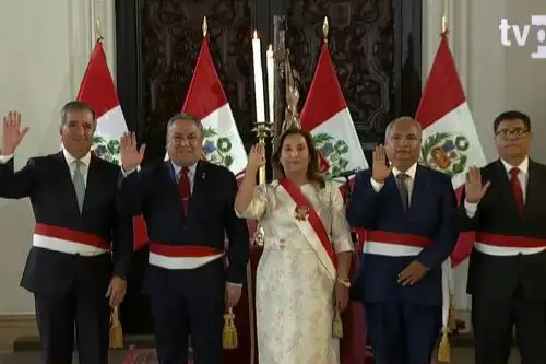 La presidenta Dina Boluarte tomó juramento hoy a los nuevos ministro de Economía y Finanzas, Raúl Pérez Reyes; de Transportes y Comunicaciones, César Sandoval Pozo y del Interior, Carlos Malaver Odias. Captura TV