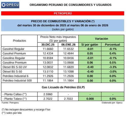 El Organismo Peruano de Consumidores y Usuarios (Opecu) informó que Petróleos del Perú (Petroperú) bajó precios del diésel B5 S-50 de uso vehicular e industrial en 0.40 soles por galón, incluido impuestos; y de gasohol y gasolina regular en 0.01 soles por galón; mientras suben precios del gasohol premium en 0.05 soles por galón y la gasolina en 0.06 soles por galón, incluido impuestos.
