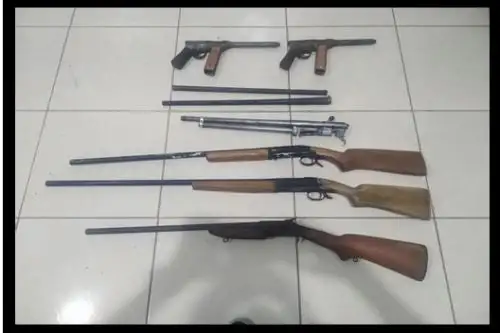 Durante el allanamiento se incautaron armas de fuego tipo retrocarga con N° de serie MV75749A rehabilitadas totalmente, dos armas de fuego tipo revolver sin marca ni serie, tres armas de fuego tipo escopeta sin marca ni número de serie, así como dos armas de fuego de fabricación artesanal tipo ametralladoras, una pistola sin marca ni número de serie abastecida con una cacerina de fabricación artesanal, abastecida con dos cartuchos 9 milímetros parabelum.