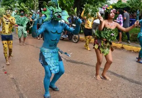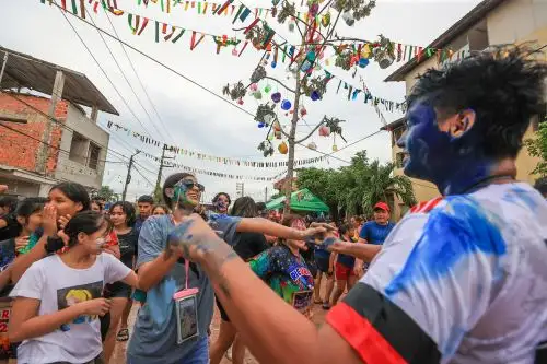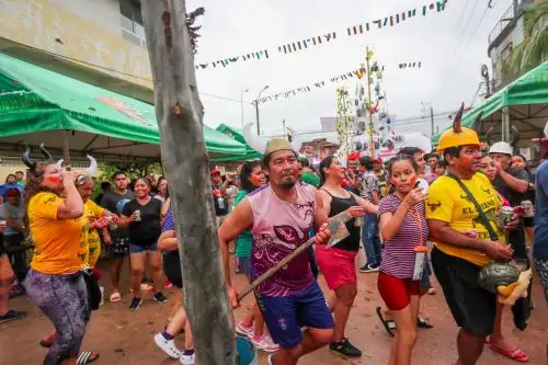 En el Carnaval Ucayalino también se juega con agua y pintura de todos los colores y los participantes se untan el rostro y el cuerpo con talco, pintura y achiote, un pigmento natural de color rojizo utilizado en la industria alimentaria y cosmética que se obtiene de las semillas de un arbusto amazónico silvestre.