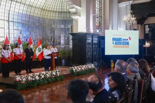 La presidenta de la república, Dina Boluarte, participa en la ceremonia de lanzamiento de las brigadas de prevención del acoso sexual en el transporte público.