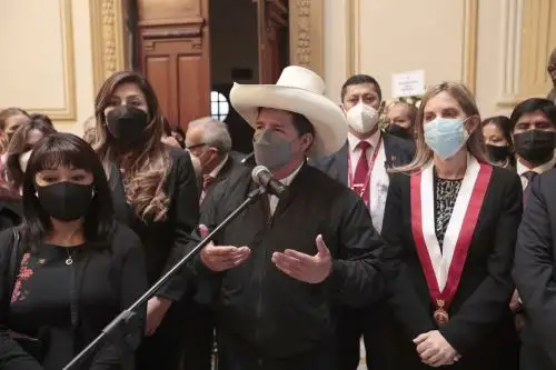 El Presidente se trasladó desde Palacio de Gobierno hasta el Congreso caminando, acompañado por la titular del Consejo de Ministros, Mirtha Vásquez, y los integrantes del Gabinete Ministerial. A su llegada al Parlamento fue recibido por la titular de dicho poder del Estado, María del Carmen Alva, y por legisladores de la bancada de Perú Libre.