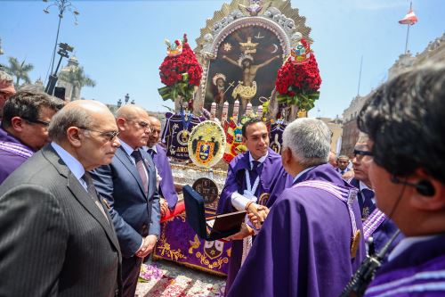 El jefe de Estado, quien pertenece a la Hermandad del Señor de los Milagros del distrito de Jesús María, lució el tradicional hábito morado del mes de octubre.