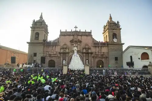 ¡Avanza, oe!, pitazos, órdenes, el griterío es un vigorizante poderoso para los cargadores, mejor que la maca. Cuando el Señor de la Resurrección sale, tañen largamente las campanas de la catedral. Lo reciben una lluvia de pétalos de rosa, una corona de drones y los bombazos de los fuegos artificiales.