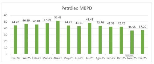 Por otra parte, la producción de gas natural registró un aumento, al pasar de 1,365 millones de pies cúbicos por día (MMCFD) en noviembre a 1,466 MMPCD en el mes de diciembre de 2025.