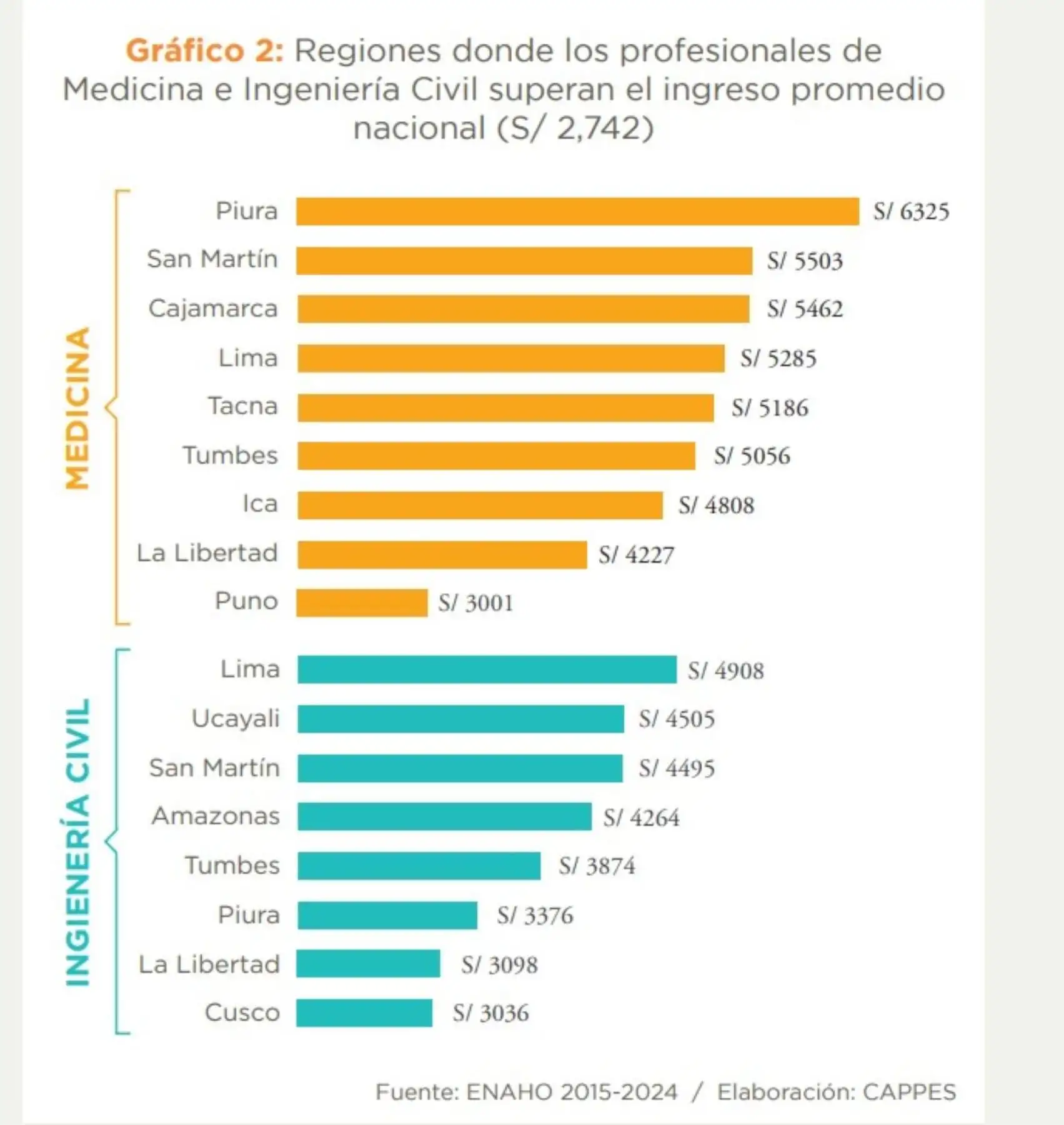 Piura tiene la profesión con el sueldo promedio más alto en el país. Un profesional de Medicina puede llegar a percibir S/ 6325. Le siguen Moquegua, con Ingeniería Mecánica (S/ 5707); San Martín, con Medicina (S/ 5503); Cajamarca, con Medicina (S/ 5462); Lima, con Medicina (S/ 5285); Tacna, con Medicina (S/ 5186); y Tumbes, con Medicina (S/ 5056).