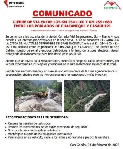 El Tramo 4 del Corredor Interoceánico Sur permanece cerrado al tráfico vehicular debido a deslizamientos de tierra y derrumbes causados por las persistentes lluvias. La zona afectada abarca desde el kilómetro 254+100 hasta el 259+680, entre los centros poblados de Chacaneque y Casahuiri, en el distrito de San Gabán, provincia de Carabaya.