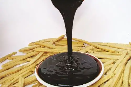 De forma líquida y algo espesa, sabor dulce y color oscuro, la algarrobina se utiliza como endulzante en la preparación de jugos, helados, yogur, galletas, postres diversos y bebidas con café.