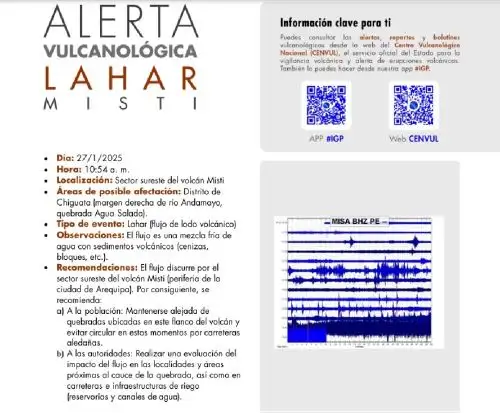 Teniendo en cuenta que el actual periodo de lluvias favorece la formación de lahares, el Instituto Nacional de Defensa Civil (Indeci) recomienda a la población vulnerable mantenerse alejada de las riberas de las quebradas que nacen en macizos volcánicos y de los ríos cuyos cauces surcan áreas aledañas a un volcán.