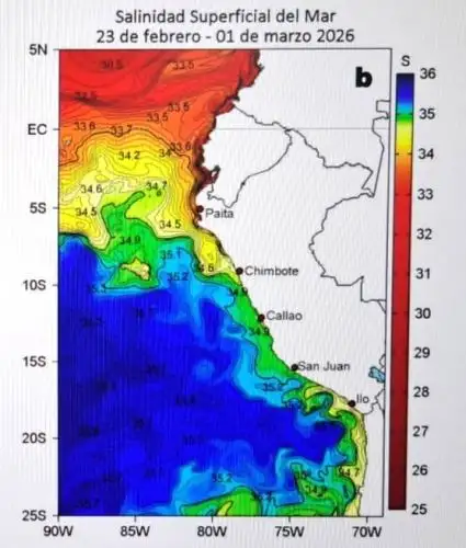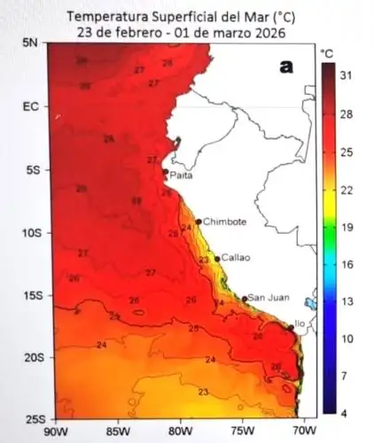 En tanto, en Huanchaco: 23 °C, Chimbote: 23,2 °C, Callao: 17,6 °C (dentro del rango normal, con +0,3 °C) e Ilo: 16,9 °C.
