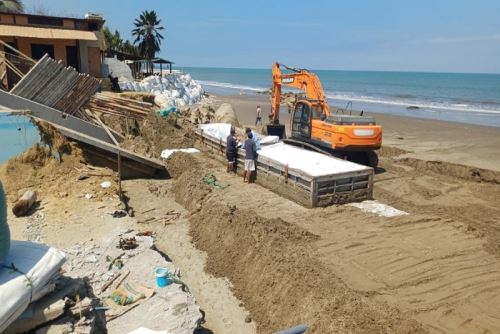Con maquinaria pesada están instalando geo bolsas en Los Pinos-Sur, pues el mar ingresó hasta las instalaciones de casas y hoteles.