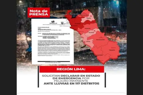 El Gobierno Regional de Lima solicita declarar en estado de emergencia por peligro inminente ante intensas lluvias a 117 distritos ya que podrían desencadenarse peligros asociados (huaicos, desbordes e inundaciones).
