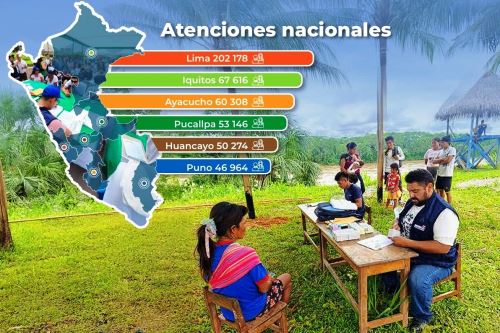 En el departamento de Lima se realizaron 4823 intervenciones, que permitieron 202 178 atenciones. Le siguieron Iquitos con 67 616 atenciones, Ayacucho con 60 308, Pucallpa 53 146, Huancayo con 50 274 y Puno con 46 964.