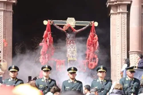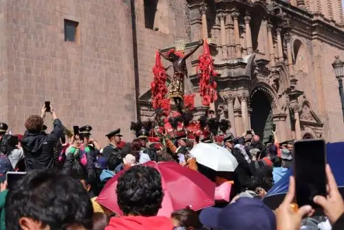 La hermandad del Señor de Los Temblores tomó en hombros al Taytacha y luego al canto de las Cha'yñas (coro en quechua) y humo de incienso, fue sacado a la luz del sol. En exteriores, la feligresía resguardada por agentes policiales, se santiguó y comenzó a acompañar a Nuestro Señor con el rezo del Santo Rosario.