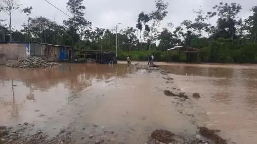 en el distrito Huallaga, se desbordó el río del mismo nombre, en los sectores Izango, Juan Vela y Pashaco. La
