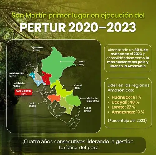 San Martín reafirma su liderazgo en la gestión turística del país al mantener, entre los años 2020 y 2023, el primer lugar en la ejecución del Plan Estratégico Regional de Turismo (Pertur), alcanzando un 80 % de avance en el último periodo evaluado, se informó.