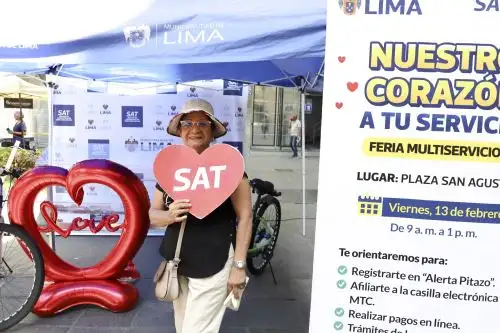 En el marco del Día del Amor y la Amistad, la Municipalidad Metropolitana de Lima, a través del Servicio de Administración Tributaria (SAT), realizó la feria “Nuestro corazón a tu servicio”, una iniciativa orientada a reconocer a los vecinos que cumplen puntualmente con el pago de sus tributos, mediante la entrega de beneficios, orientación personalizada y servicios gratuitos.