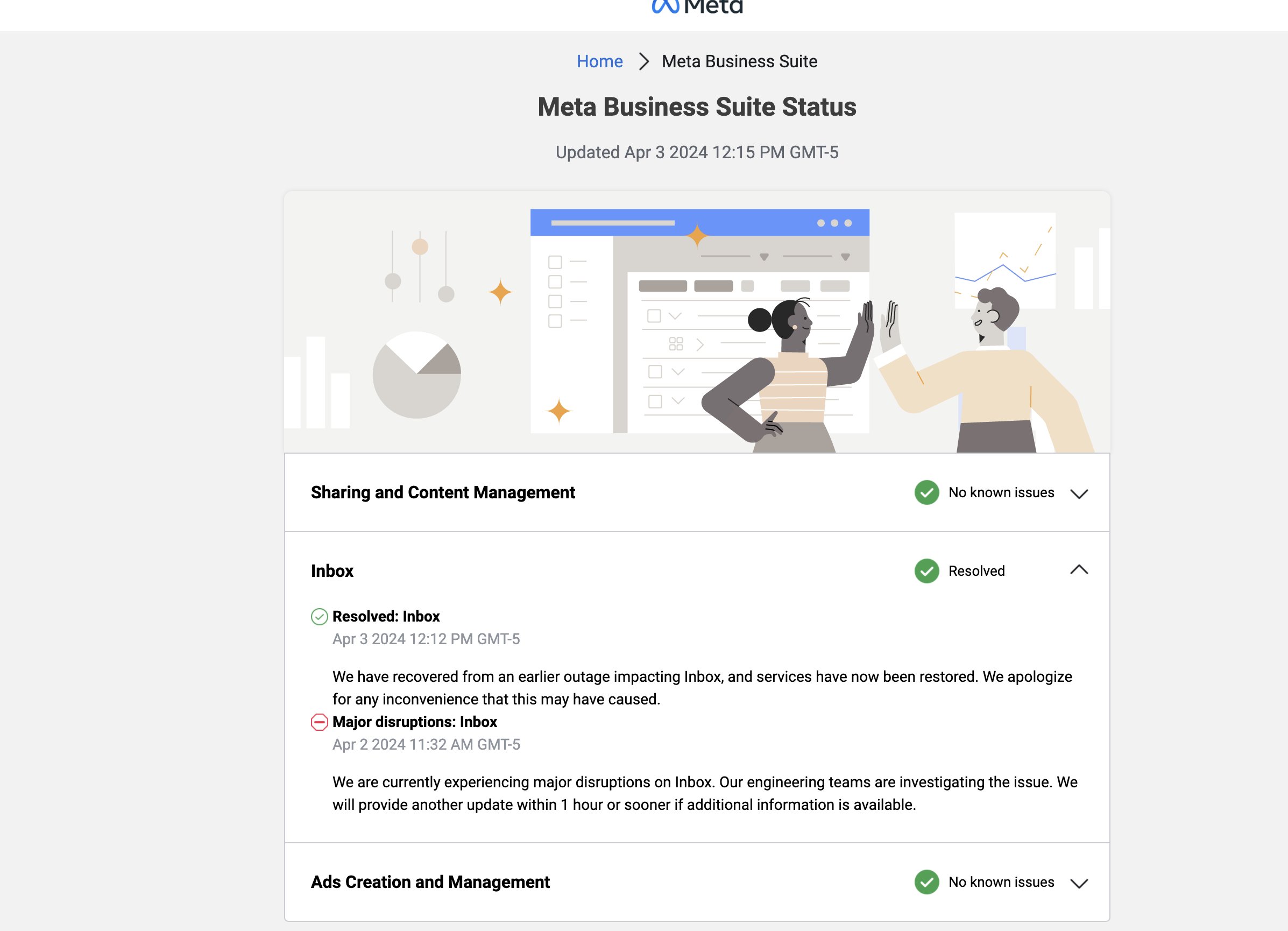 Por otro lado, el sitio web oficial de Meta confirmó que hubo problemas en la gestión de mensajería con la herramienta Meta Business Suite -que administra Facebook, Instagram y WhatsApp. El problema fue resuelto luego de más de 30 minutos.