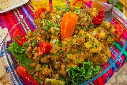 Por último, agregar papas sancochada en cuadrito, culantro y ají amarillo entero y a servir con una porción de arroz.