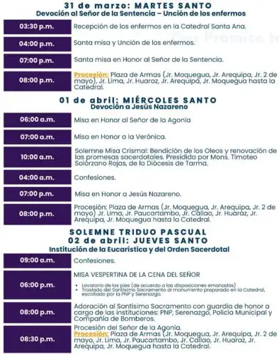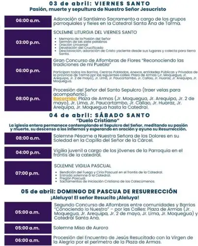 Otras actividades similares tendrán lugar en los distritos tarmeños de Acobamba, Huaricolca, La Unión Leticia, Palca, Palcamayo y Tapo, con lo cual la celebración de la Semana Santa en Tarma se vislumbra como una de las más especiales del Perú.