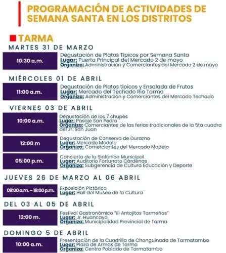 Por ejemplo, el martes 31 de marzo a las 10:30 a.m. está programada la degustación de platos típicos por Semana Santa, en la puerta principal del mercado 2 de Mayo de la ciudad de Tarma. Al día siguiente, a las 11:00 a.m., se realizará otra degustación de platos típicos y de ensaladas de fruta en el Mercado del Techado Río Tarma. El viernes 3 de abril tendrá lugar, a las 10:00 a.m., en el Pasaje San Pedro, la tradicional degustación de los Siete Chupes; mientras que al mediodía se realizará la degustación de dulces de durazno en el Mercado Modelo. La jornada de ese día culminará con un concierto de la Sinfónica Municipal, a partir de las 5:00 p.m. en el auditorio Fortunato Cárdenas de la municipalidad provincial de Tarma.
