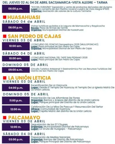 Asimismo, el sábado 4 de abril se realizará, a las 6:00 p.m., una visita guiada a las lagunas de Mamacocha y Raypicocha, ubicadas en el distrito de Huasahuasi. En el distrito de San Pedro de Cajas tendrá lugar, el viernes 3 de abril, el primer concurso del Poncho Sampedrano – Mulloponcho, en la plaza principal de esa localidad. Al día siguiente, se desarrollará el primer concurso de Tapiz Sampedrano 2026, en la plaza principal; y el domingo 5 de abril, desde las 9:00 a.m., se desarrollará el circuito turístico, artesanal y gastronómico “Por los recursos turísticos del distrito de San Pedro de Cajas”.