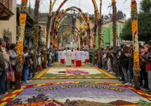 Sin duda, los grandes tapices y arcos florales que elaboran las comunidades campesinas, los centros educativos, las entidades públicas y privadas, así como las diversas organizaciones de la sociedad, son el sello distintivo de la Semana Santa que conmemora la pasión, muerte y resurrección de Jesucristo.